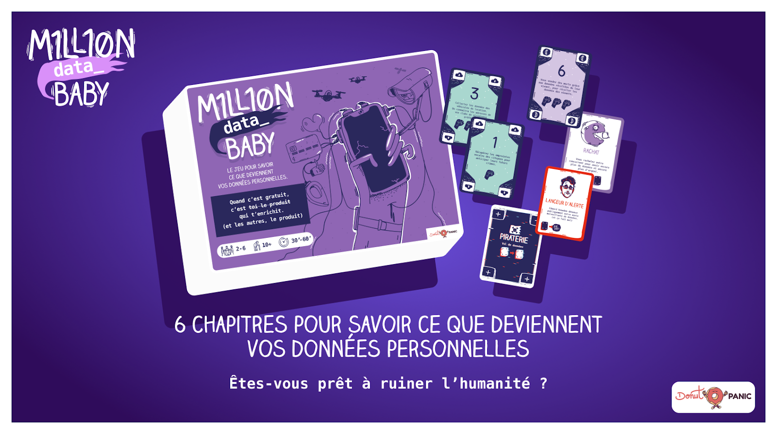 Après des soirées à décortiquer les affaires, les scandales et les procès autour des données personnelles, nous avons créé plusieurs mécaniques autour de 6 chapitres, où chacune des cartes relève d’un fait réel qui est directement consultable sur notre site www.milliondatababy.com
